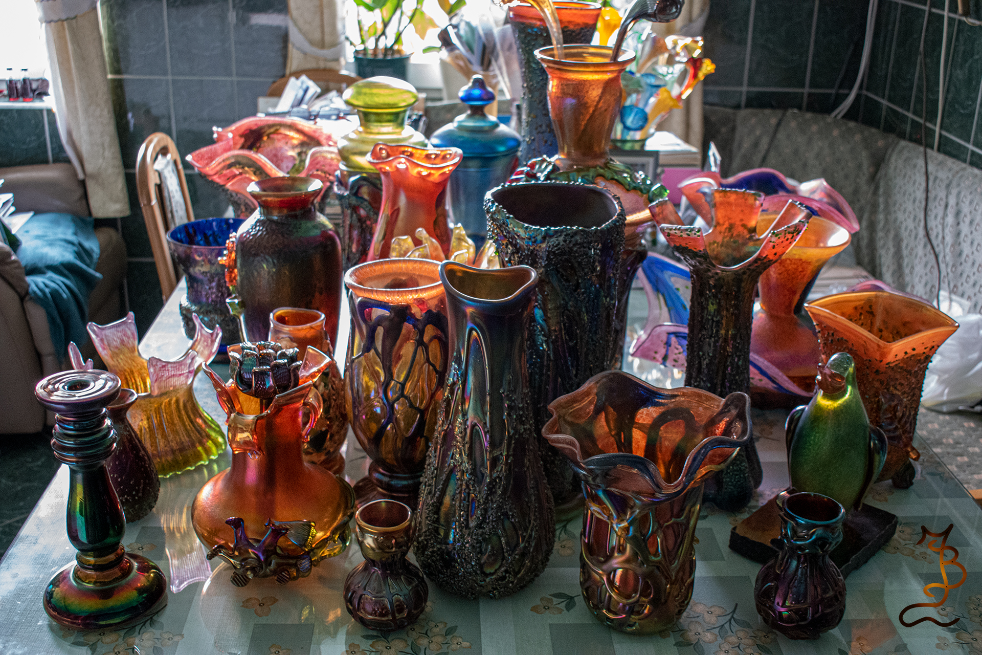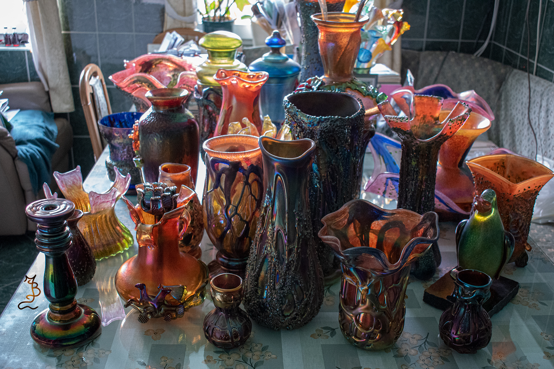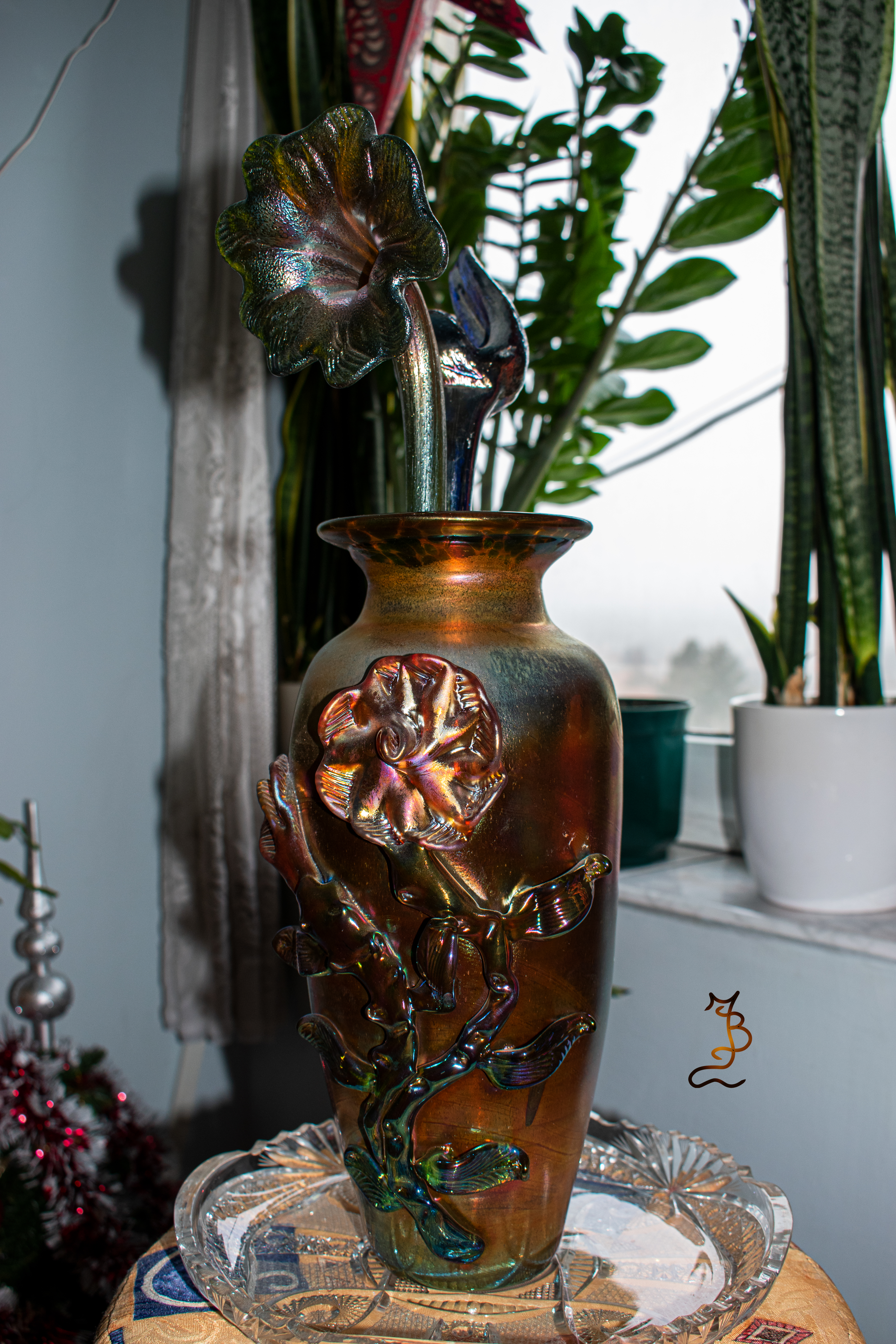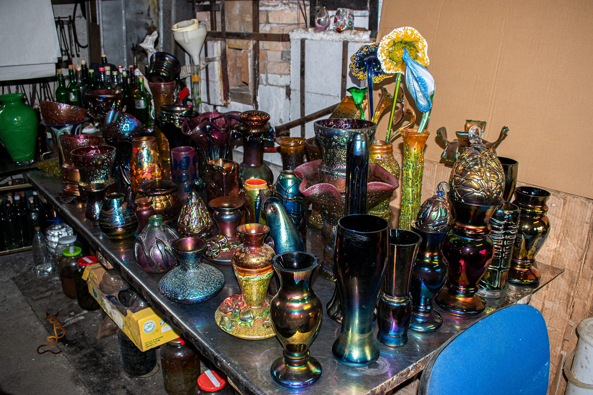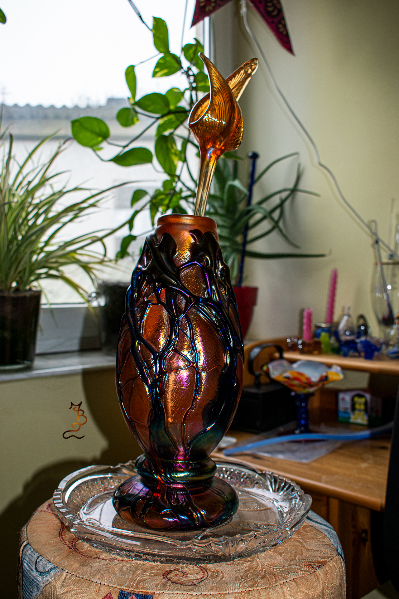Irizált üvegek, üveg virágok